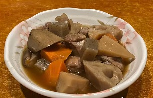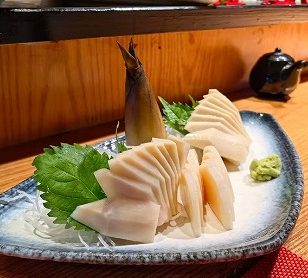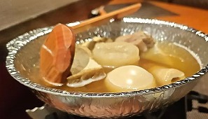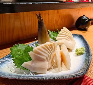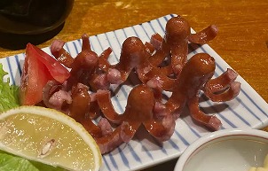 当日のおばんざい、タケノコの刺身、肉じゃが、焼き鳥、筑前煮、おれ特製サラダ |
